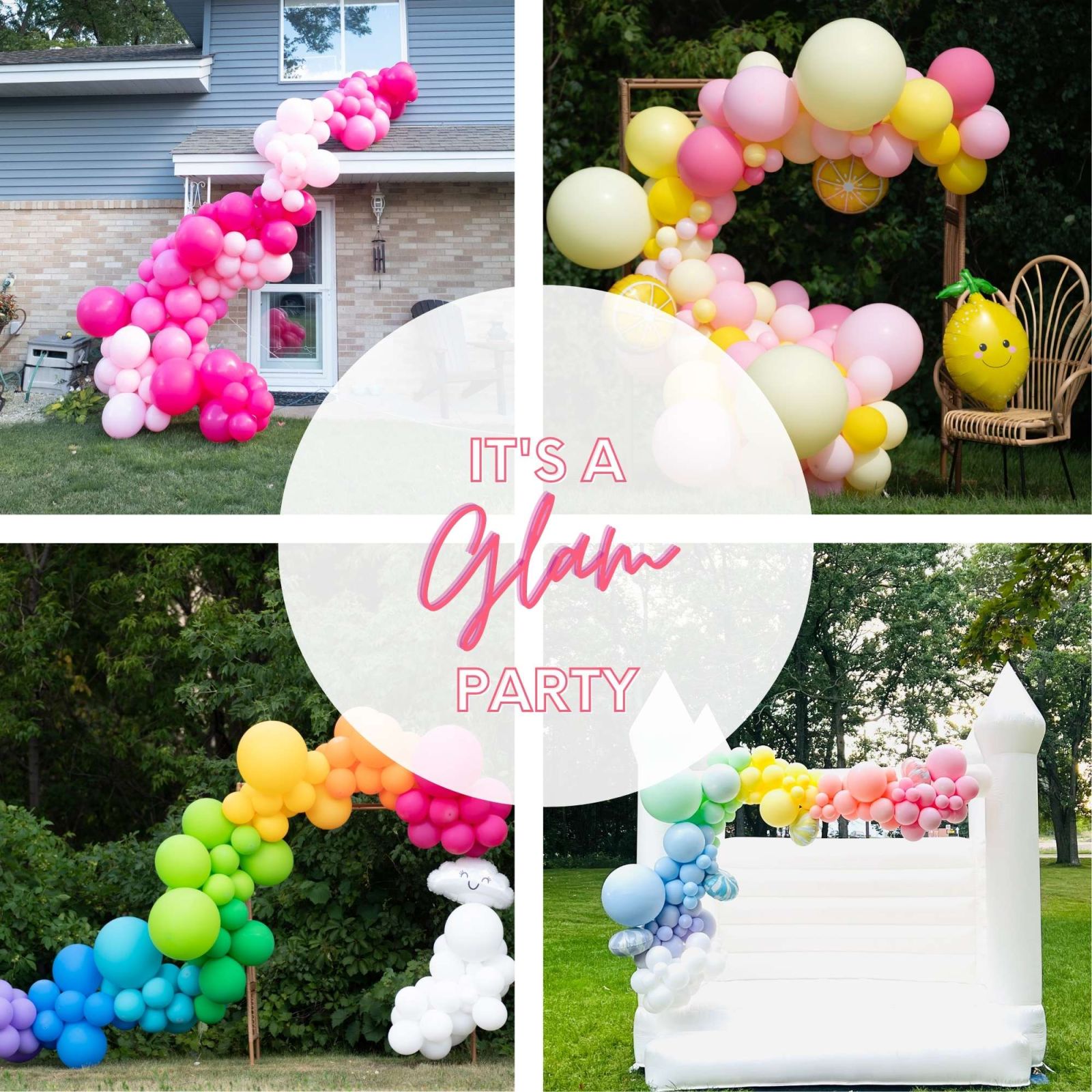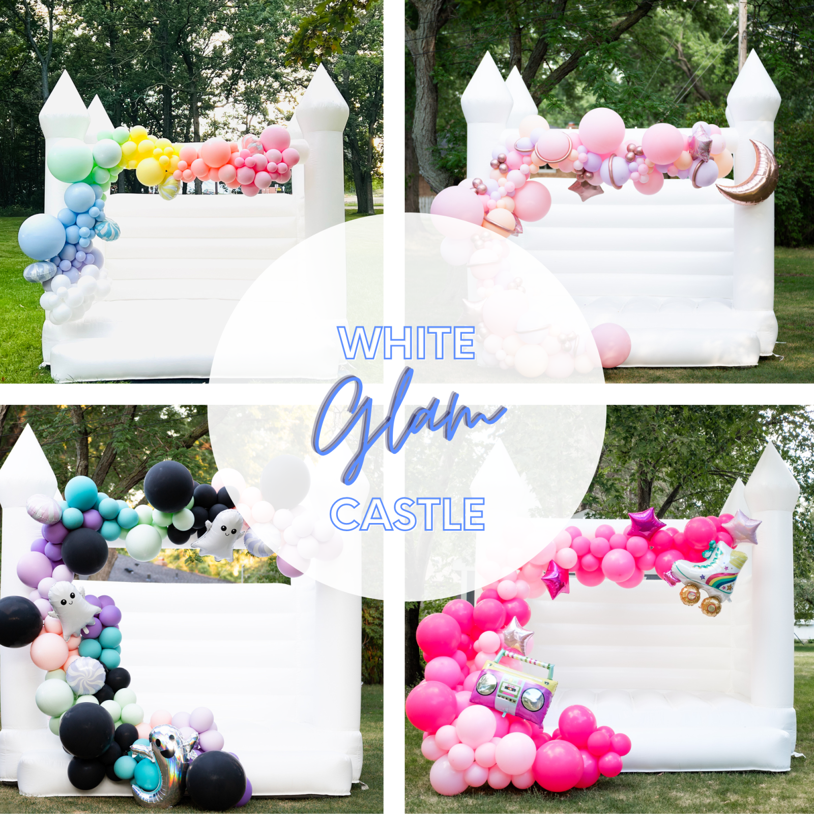 A totally unique bounce house experience, our Luxe White Glam Castle is a PERFECT backdrop to your next event! Add balloons to the bouncy house and let us do all of the work!